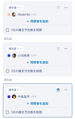 例えば1つの枠に上限3名の予約を受け付けたい場合、以下の画像のようにOr条件にて3名の主催者を設定いただければ、上限3名の調整相手が予約可能となります。