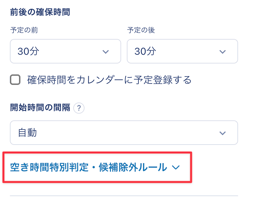 - 空き時間リンクの編集画面を開き、「候補」カテゴリー最下部の「空き時間特別判定・候補除外ルール」のトグルを開きます
