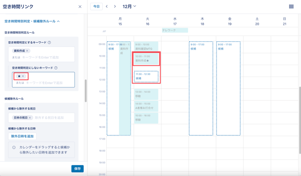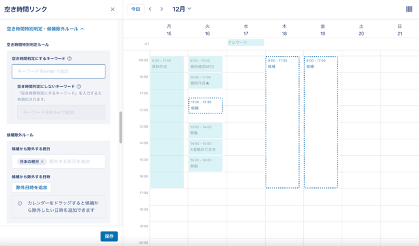 「空き時間判定にする」キーワードを含むカレンダー予定のうち、空き時間判定にしたくない予定がある場合は、キーワードとタイトルが部分一致した予定の時間帯を候補にしないことが可能です。