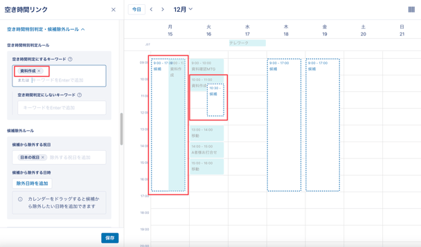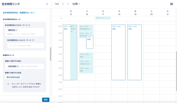 - 右側のカレンダービューで候補を確認し、「保存」をクリックし、完了です。