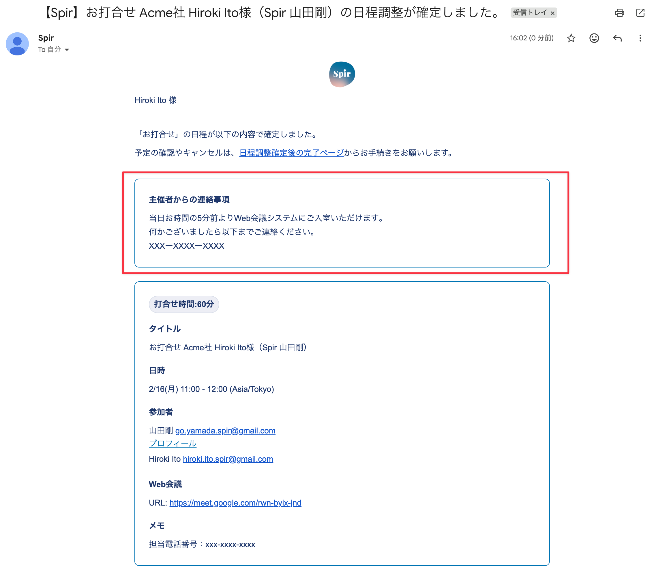 有料プランをご利用の場合、日程確定メールをカスタマイズすることが可能でございます。 詳しくは日程確定メールやリマインドメールの内容をカスタマイズするをご確認ください。