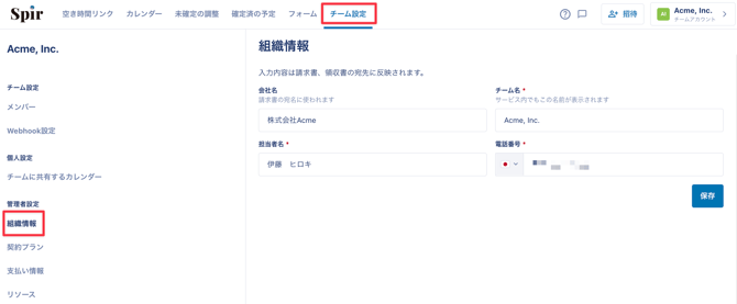 会社名・チーム名を変更する 上部メニューより「チーム設定」を選択します。 表示される左側のメニューより「組織情報」をクリックし、会社名・チーム名を変更してから保存します。 「チーム設定」は管理者権限がある方のみ、操作が可能です。 ここで設定した「会社名」と「チーム名」は、請求書および領収書の宛名として使用されます。
