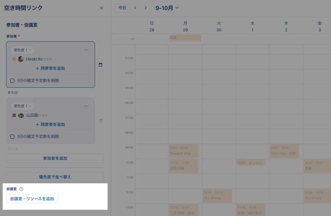 - 設定が完了しました。参加メンバーと会議室の予定を抽出して、空き時間リンクが作成できます。
