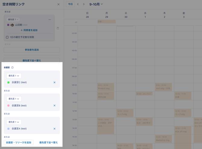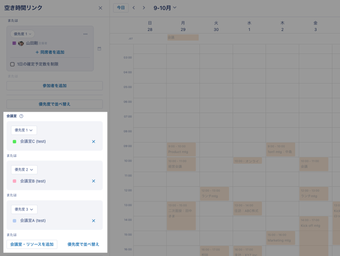 会議室を複数選択し、必要に応じて優先順位を設定します。(最大20個まで設定可能)