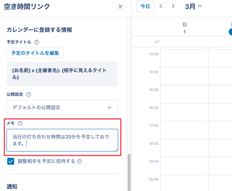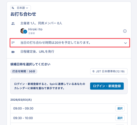 20分や50分などの 選択肢にないお打ち合わせ時間をご希望の場合、打ち合わせ時間を 30分・60分など多めに設定し、メモ欄などで「⚪︎⚪︎分での実施を予定しております。」のように、実際の想定実施時間を調整相手にお知らせください。