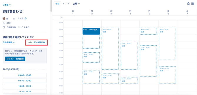 日程の候補をリスト/カレンダー表示で見たい 日程確定画面の候補の表示を、リスト・カレンダー表示 間で切り替えることが可能です。日程確定画面上のボタンをクリックしてください。 リスト表示からカレンダー表示に変更する場合 カレンダー表示からリスト表示に変更する場合 Spirユーザーの場合、ログインしてカレンダー表示にすると、ご自身の予定に重ねて候補を確認することができます。