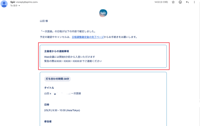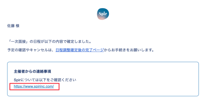 - 調整相手が日程を確定すると、カスタマイズされた確定通知のメールが送信されます。