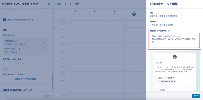 - 日程確定メール上部に記載したい任意の文章を「主催者からの連絡事項」欄に入力し、「完了」をクリックします。 (文章の上限は700文字です)