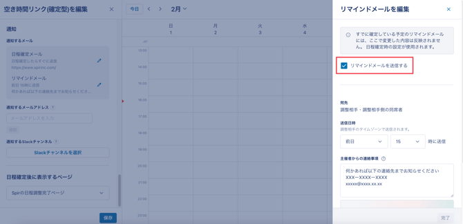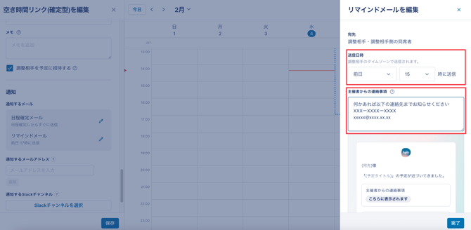 - リマインドメールの「送信日時」、リマインドメールに記載したい任意の文章を「主催者からの連絡事項」欄に入力し、「完了」をクリックします。(文章の上限は700文字です)