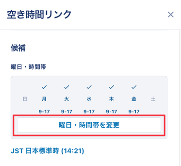 1. 空き時間リンクの編集画面の「候補」箇所から「曜日・時間帯を変更」をクリック