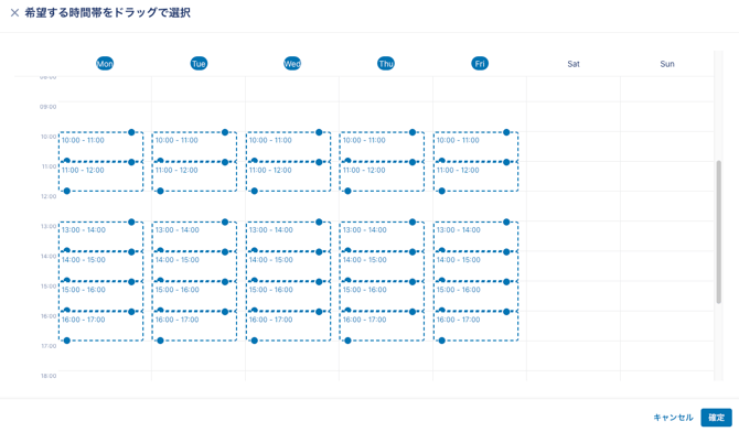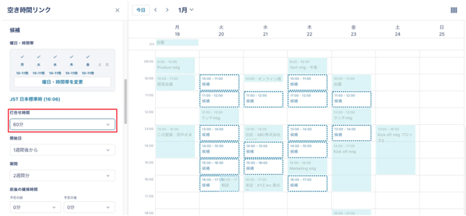 この設定を行うことで、上図21日のように10時半から空き時間があっても候補には表示されず、毎時0分開始の時間帯のみが候補として表示されます。