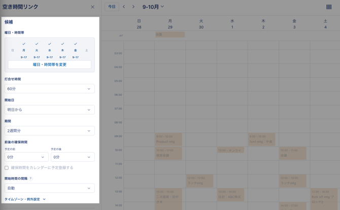 空き時間リンクでは、事前に設定した条件に合致する「予定のない時間」を候補として、日程調整することができます。ただし、条件の設定次第では空き時間でも候補として表示されません。候補の条件がご希望に沿って設定されているかご確認ください。