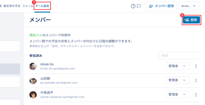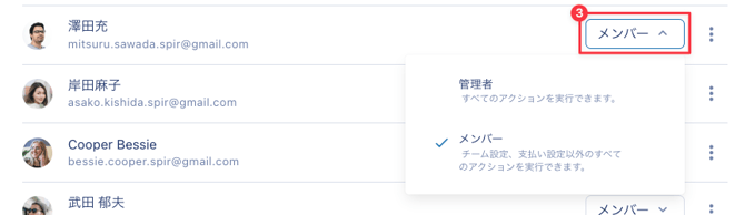 管理者を追加・変更する これらの操作はチームの管理者のみが実施可能です。 まずはSpirサービス内、画面右上に表示されるチームアイコンを選択してください。 所属チームの「メンバー」画面にて設定いただけます。新しくメンバーを招待したい場合は、まず管理画面に招待してください。 既存のメンバーの権限を変更したい場合は、「メンバー」を選んで希望する権限を選択します。※なお、ご自身を管理者から外すことはできませんので、他のメンバーを管理者に昇格させ、そのメンバーに権限の変更をお願いしてください。