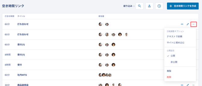 - 作成した空き時間URLの右上「•••」からURLを複製したり、まだ公開したくないURLを非公開設定にすることも可能です。