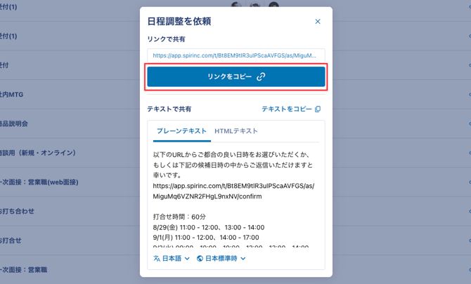 - もしくは、リンクを閉じた際に表示されるポップアップの「リンクをコピー」もしくは作成したリンクの左下の「リンクをコピー」を押下して、メールやMessengerなどにペーストして調整相手に送付してください。