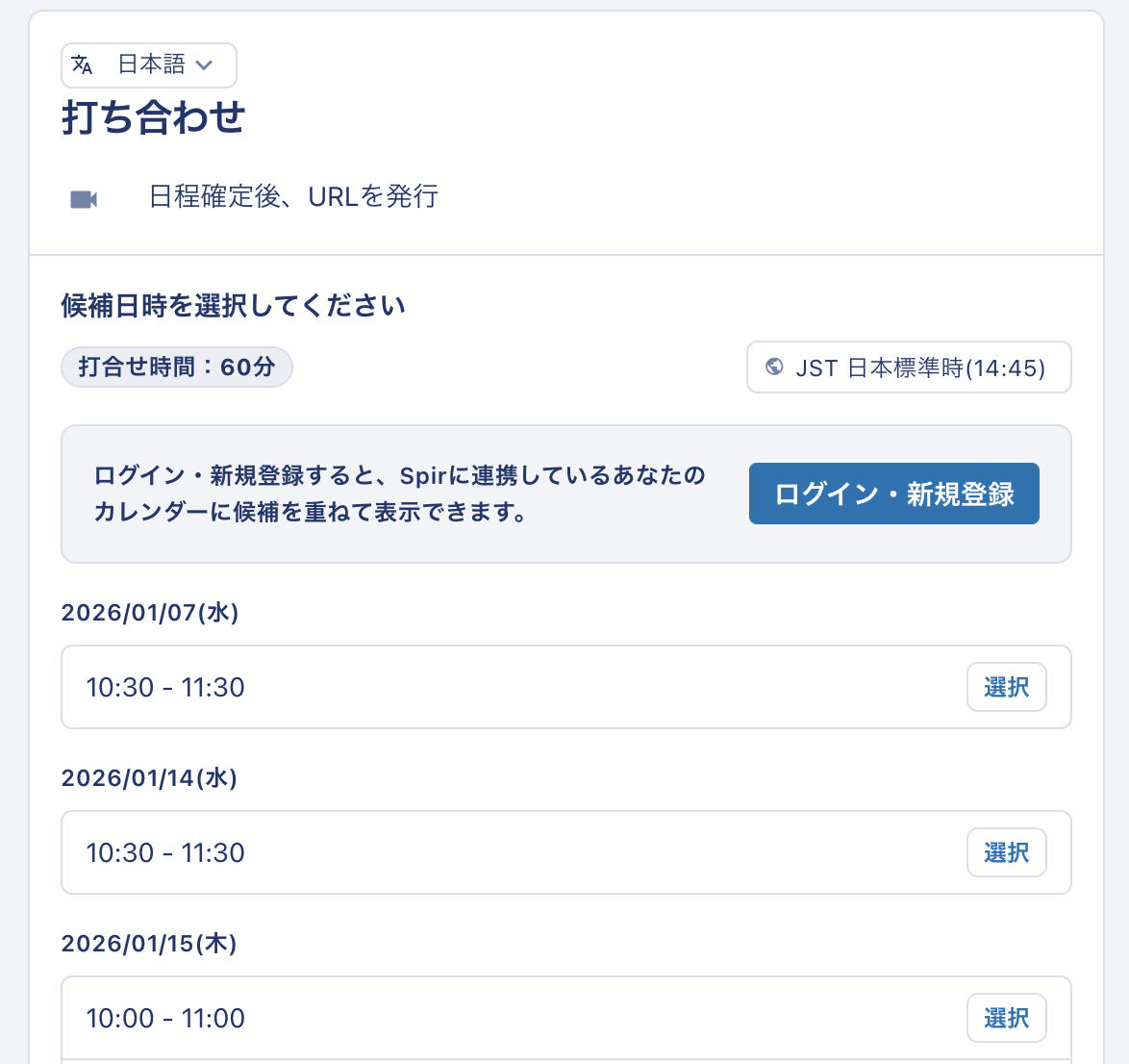 1. 調整相手がリンクをクリックすると、日程確定用のページが表示されます。
