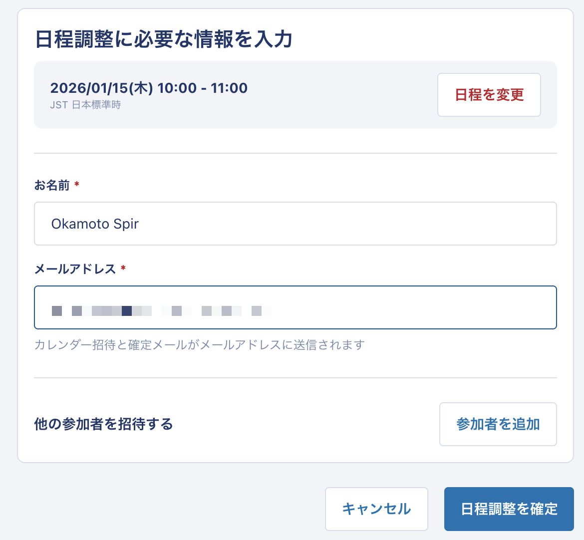2. 調整相手が日程を選択すると、必要な情報を入力するフォームが表示されますので、必須事項に記入し「日程調整を確定」をクリックします。