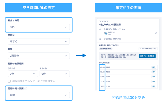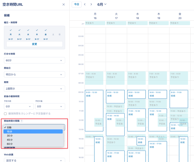 「開始時間の間隔」とは、提示される候補日時の開始時刻同士の時間差を指します。この設定機能を使うことで、候補日時の開始時刻を何分刻みにするかを設定することができます。
