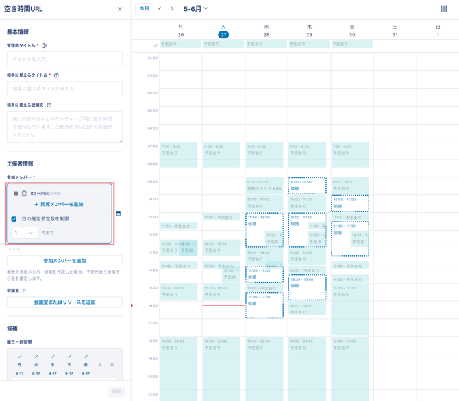 この機能は、「1日の確定予定数を制限」 するものです。設定したい空き時間リンクの参加メンバー設定でこの項目にチェックを入れ、希望する制限数を設定することで有効になります。