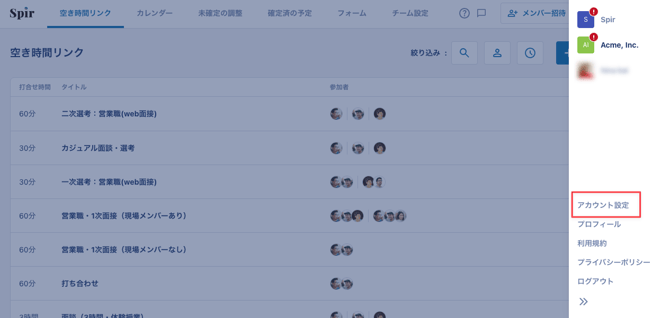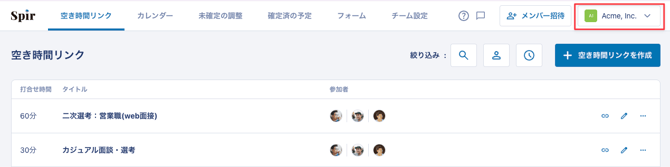 1. (Spir管理画面右上)ご自身のチーム名の記載がある部分をクリックします。