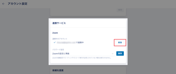 💡上図のメッセージが表示されず、「連携中」と表示されている場合でも、Zoom連携が切れている可能性がございます。 その場合、一度「解除」ボタンをクリックしZoomの連携を解除いただき、再度連携を行ってください。