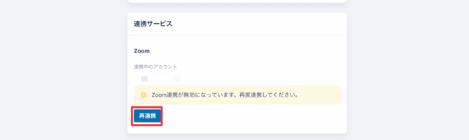 3. Zoomの連携が切れている場合、Zoom連携箇所に 「Zoom連携が無効になっています。再度連携してください。」と表示されておりますので 「再連携」ボタンをクリックし、Zoomの再連携を行なってください。