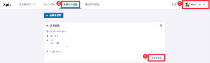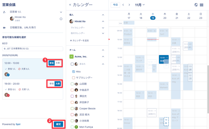 調整用URLを受け取った調整相手は、リストもしくはカレンダーから都合のよい候補をクリックして確定するだけで「参加/欠席」の回答が完了します。Spirを使っていない方でも確定できますし、Spirユーザーなら候補と自分の予定を見比べながら確定することも可能です。
