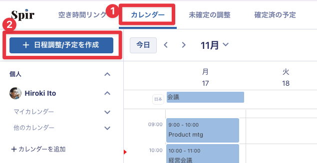 - 上部メニューの「カレンダー」を選択し、「+日程調整/予定を作成」より「候補を提案」を選択。