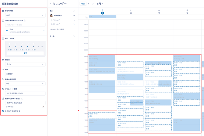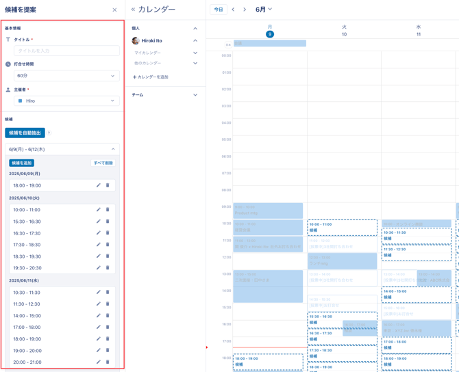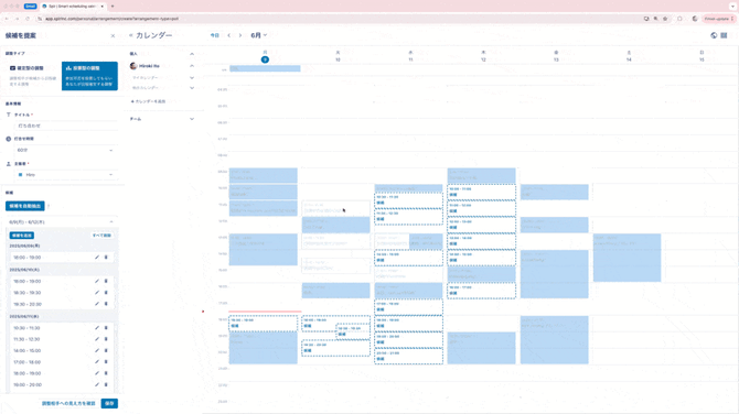 - 候補は作成開始時に自動抽出され、カレンダーに表示されています。