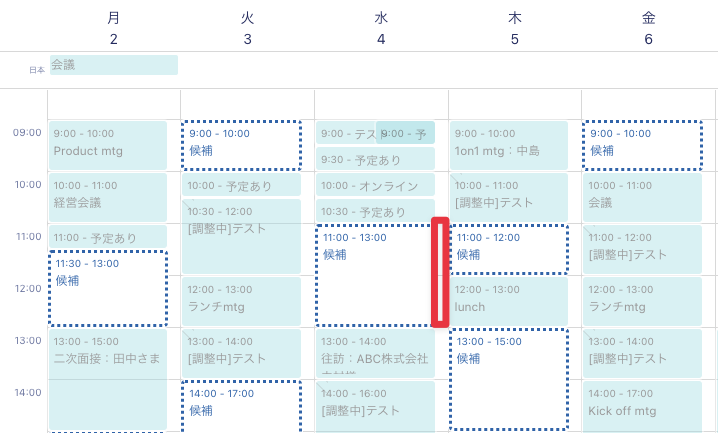 - 連携カレンダーにて「ブロック」等の予定を1つ作成いただくと、すべての空き時間リンクにて、候補が出ないようにすることが可能です。