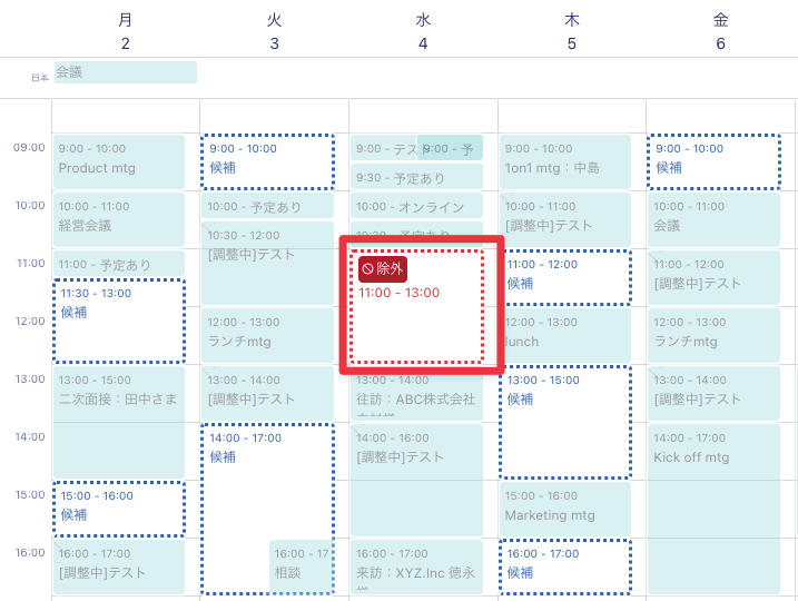 除外したい時間帯の「候補」の右端をクリックすることで、対象の時間を手動で除外することが可能です。
